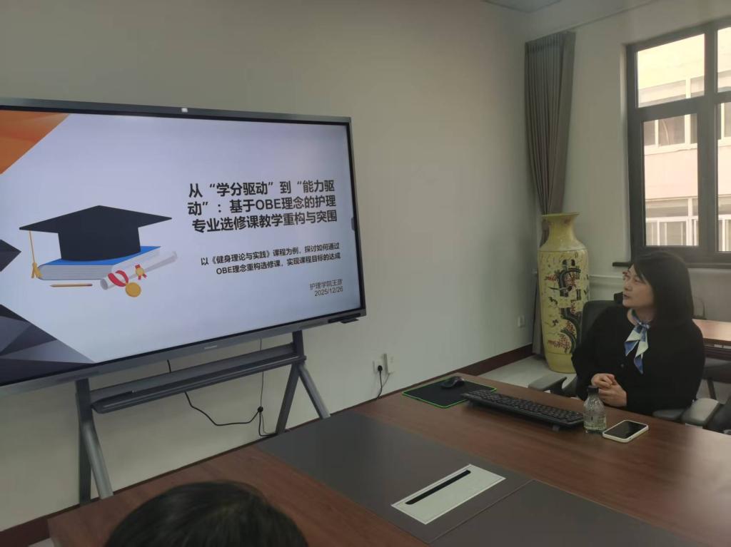 12月26日,《从“学分驱动”到“能力驱动”:基于OBE理念的护理专业选修课教学重构与突围》教学沙龙在护理学院308会议室举行。护理学院教学院长王恩军主持本次活动,各教研室骨干教师、课程负责人共30余人参会。